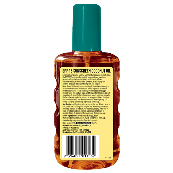 Embrace Reef's iconic coconut scent and unlock your ultimate glow. Reef SPF 15 Sunscreen Coconut Oil Spray provides broad spectrum protection from the harmful effects of UVA and UVB rays. The moisturising oil formulation glides on, is fast drying, and absorbs quickly to leave skin feeling soft and supple.